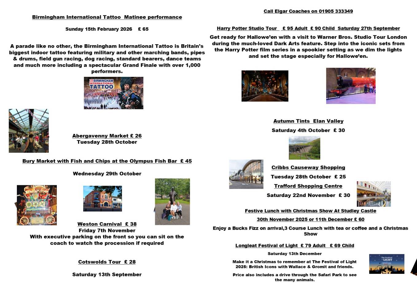 Robert Higgitt1 April 2024 Would just like to say we went on the tour of Coronation Street on Easter Sunday we had a fabulous day and the driver (Josh) was brilliant really polite & helpful and on time on all pickups and stops of for service stations etc Jill Pitt31 October 2023 Mark was first class whole weekend wonderful Mark Bartholomew29 August 2023 Excellent day. Day off from work. Great 👍 decision. Will definitely be having more fun. Thank you 😊 💓. Great day. Richard Underwood23 August 2023 Hi, we used Elgar coaches for a trip to Bury and then a fish and chip supper. What a brilliant experience from the time it was booked so the time we left the coach staff were brilliant driver exceptional very reasonably priced will use them again. Thank you Alison Vernalls2 April 2023 Brilliant day out at the Harry Potter studios. Very helpful and friendly driver. Becky Brill29 December 2022 Have used this company a couple of times fir trips to the seaside with my kids, will be using them again shortly and can't wait! Staff are always friendly from booking to drivers, prices are fantastic, makes taking the kids for a day trip so much easier and less stressful 😀 Marina Rowley6 December 2022 Went on the Kew garden trip overnight in London it was brilliant we were well looked after, definitely recommend elgar coaches Harleigh Kamal29 May 2022 A overall friendly and approachable team members.Google rating score: 4.5 of 5, based on 18 reviews